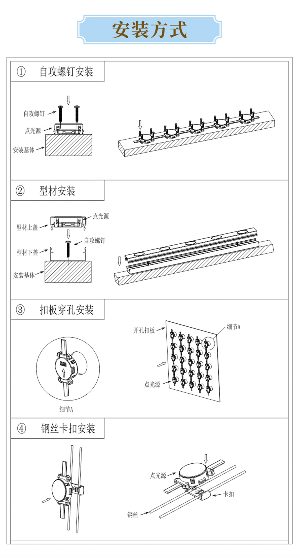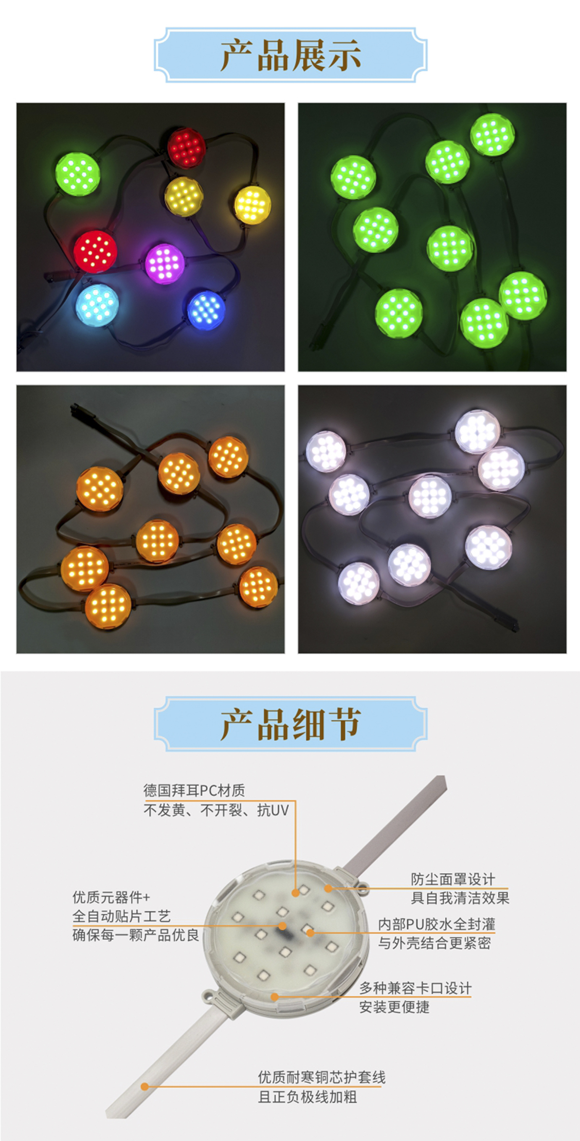 產(chǎn)品用途: 1.采用正面全封灌膠結(jié)構(gòu),散熱性能好,防護等級高; 2.采用戶外專用防水燈珠,色彩純正,性能穩(wěn)定; 3.搭載明微、聯(lián)芯科高性能驅(qū)動 IC,刷新頻率高,色彩表現(xiàn)好; 4.該產(chǎn)品為較大型的 LED 點光源,亮度較高; 適用于大型建筑物的景觀照明及大型橋梁輪廓勾勒。 安裝方式: 1.卡鋁槽 2.裝鋼絲卡扣 3.打孔安裝. 4 螺絲固定