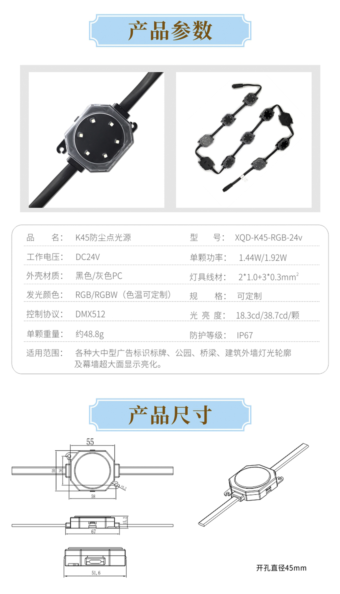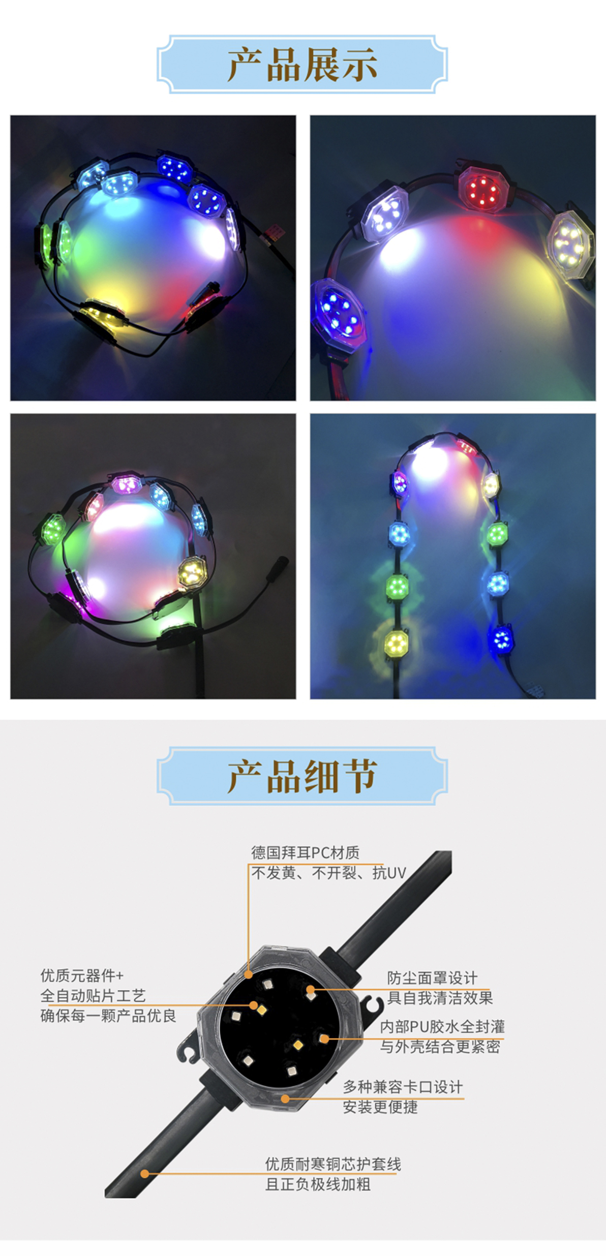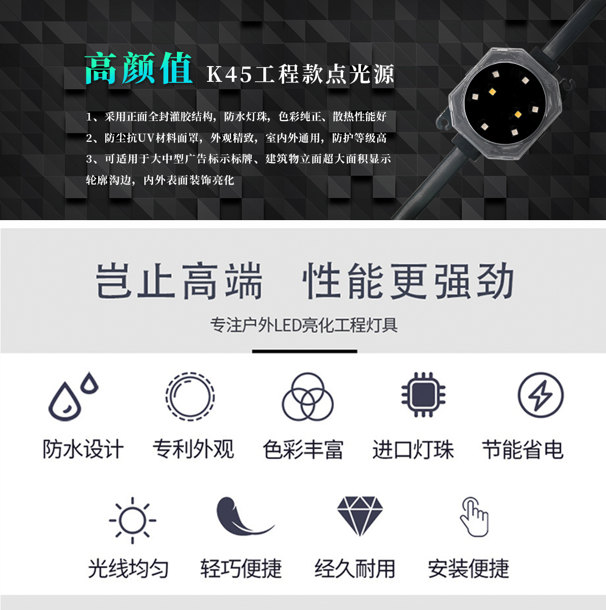 產(chǎn)品特點: 1.采用正面灌膠和獨(dú)特PC罩,防護(hù)等級高; 2.加厚型優(yōu)質(zhì)阻然膠料,抗UV、抗鹽霧、耐沖擊; 3.適應(yīng)多種安裝方式,安裝簡單可靠; 4.優(yōu)質(zhì)進(jìn)口燈珠,亮度高、色彩純正,穩(wěn)定性好; 5.該產(chǎn)品做工優(yōu)良,性價比高,是大型建筑物的景觀亮化及大型橋梁燈光的理 想產(chǎn)品。 安裝方式:1.卡鋁槽 2.裝鋼絲卡扣 3.打孔安裝 4.打螺絲固定