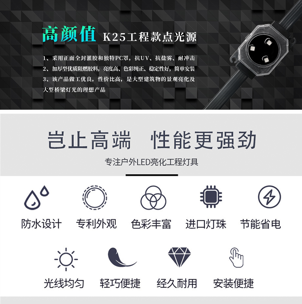 產(chǎn)品特點: 1.采用正面灌膠和獨特PC罩,防護等級高; 2.加厚型優(yōu)質(zhì)阻然膠料,抗UV、抗鹽霧、耐沖擊; 3.適應多種安裝方式,安裝簡單可靠; 4.優(yōu)質(zhì)進口燈珠,亮度高、色彩純正,穩(wěn)定性好; 5.該產(chǎn)品做工優(yōu)良,性價比高,是大型建筑物的景觀亮化及大型橋梁燈光的理 想產(chǎn)品。 安裝方式:1.卡鋁槽 2.裝鋼絲卡扣 3.打孔安裝 4.打螺絲固定