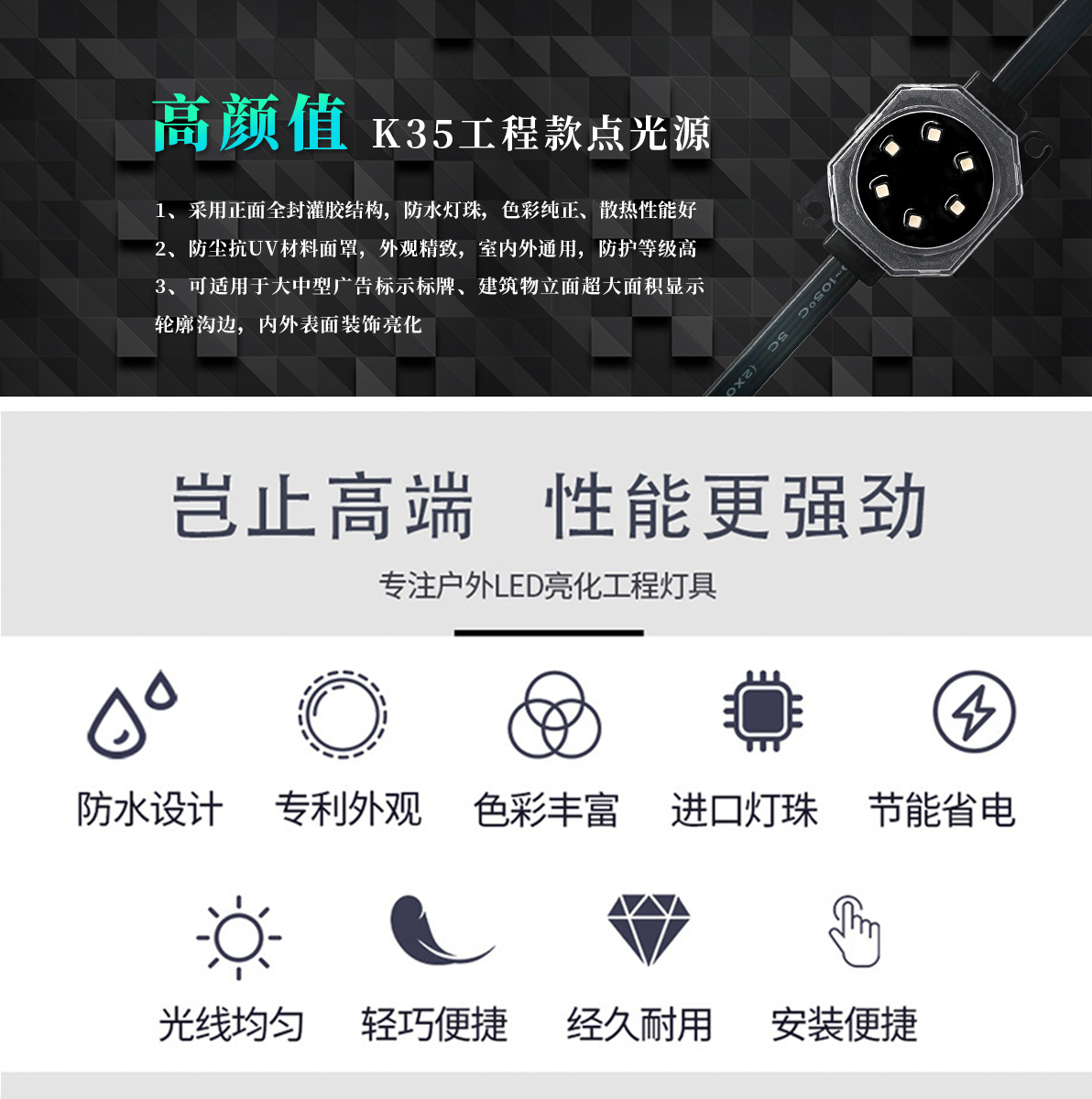 產(chǎn)品特點(diǎn): 1.采用正面灌膠和獨(dú)特PC罩,防護(hù)等級(jí)高; 2.加厚型優(yōu)質(zhì)阻然膠料,抗UV、抗鹽霧、耐沖擊; 3.適應(yīng)多種安裝方式,安裝簡(jiǎn)單可靠; 4.優(yōu)質(zhì)進(jìn)口燈珠,亮度高、色彩純正,穩(wěn)定性好; 5.該產(chǎn)品做工優(yōu)良,性?xún)r(jià)比高,是大型建筑物的景觀亮化及大型橋梁燈光的理 想產(chǎn)品。 安裝方式:1.卡鋁槽 2.裝鋼絲卡扣 3.打孔安裝 4.打螺絲固定