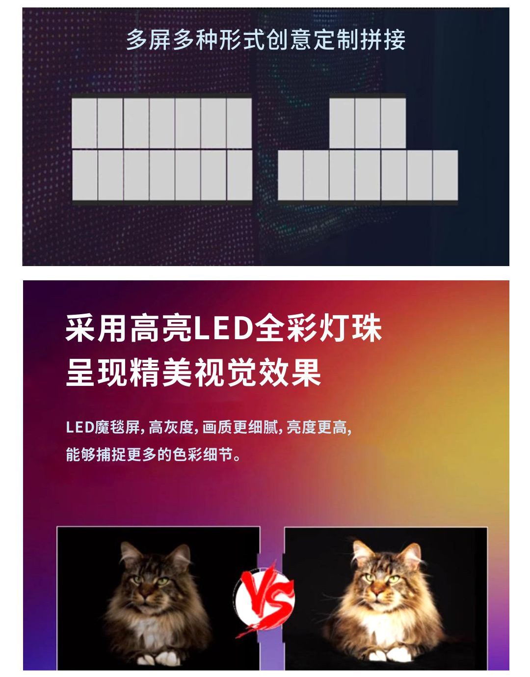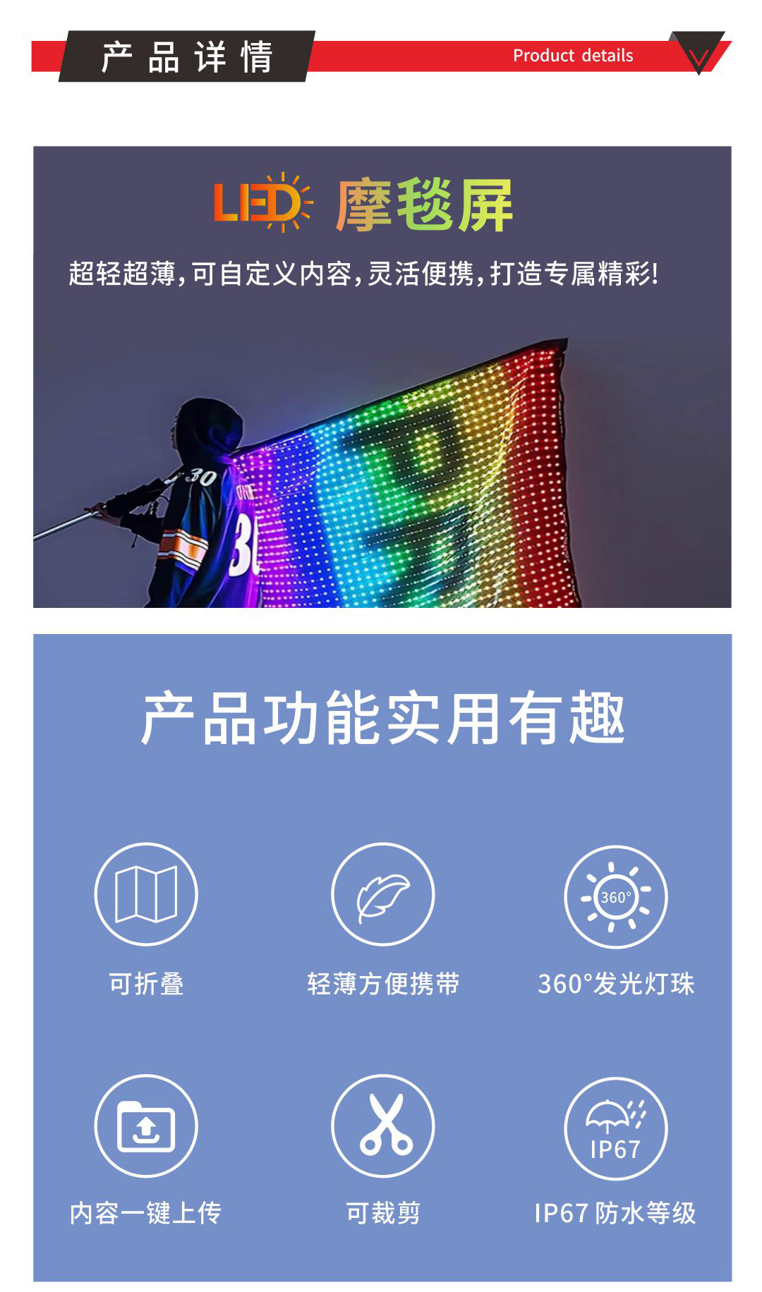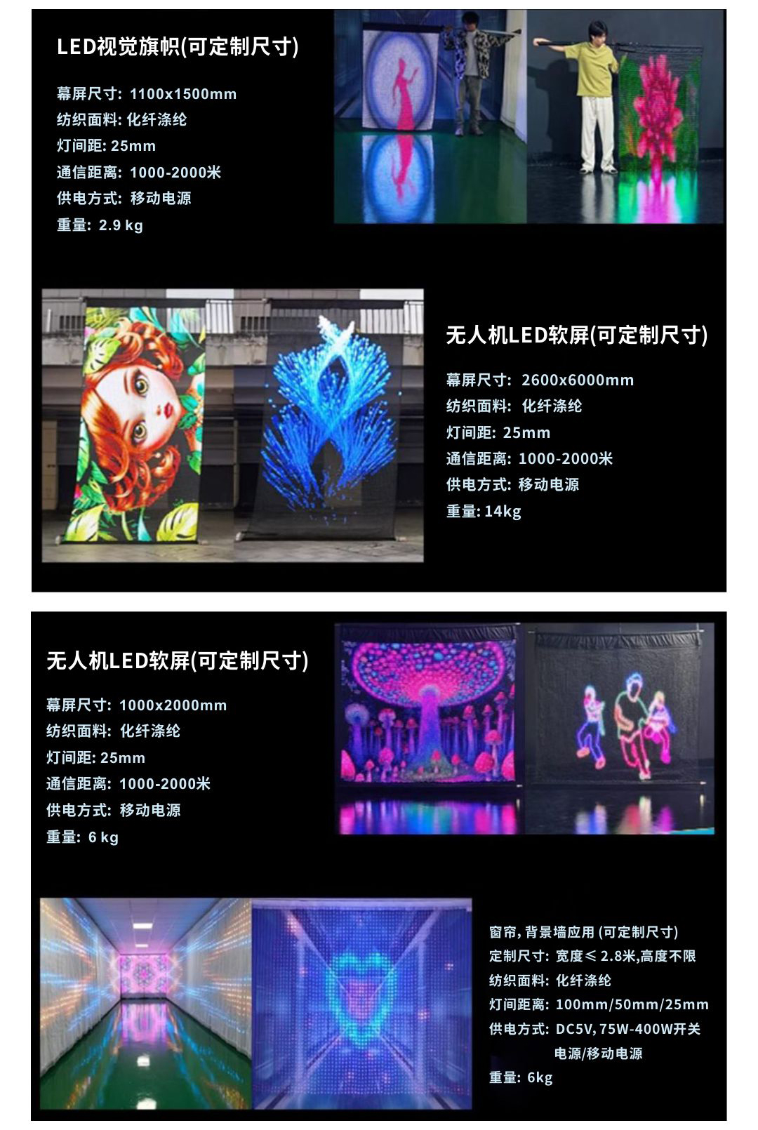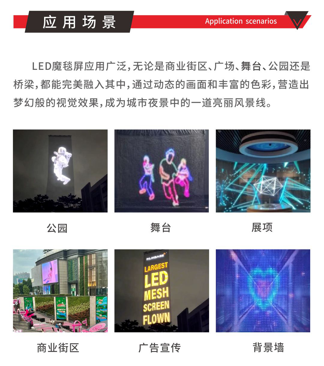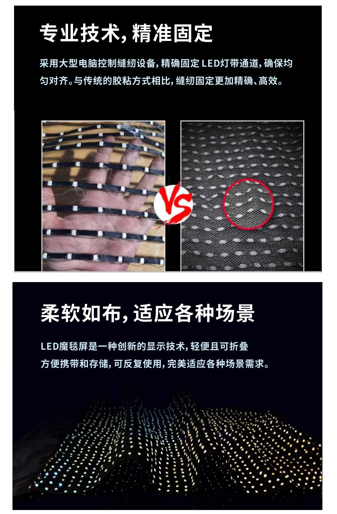 LED魔毯屏以LED燈珠為核心光源,具有高效節(jié)能、環(huán)保、壽命長等特點(diǎn)。通過數(shù)以千計的LED燈珠精細(xì)編織在柔軟的皮線中,形成了流光溢彩的燈串,能夠呈現(xiàn)出細(xì)膩、生動的色彩和圖像 應(yīng)用場景 室內(nèi)裝飾 LED魔毯屏在室內(nèi)裝飾中展現(xiàn)出極高的創(chuàng)意價值。它可以作為墻面、天花板或地面裝飾,呈現(xiàn)流動的光影、變幻的色彩或定制化的圖案與動畫,為空間注入夢幻氛圍。無論是現(xiàn)代簡約、奢華典雅還是前衛(wèi)時尚的風(fēng)格,魔毯屏都能完美適配。 舞臺燈光 在舞臺表演中,魔毯屏能夠通過動態(tài)光影效果為演員和場景提供全方位的支持。它可以營造浪漫、緊張或奇幻的氛圍,引導(dǎo)觀眾視線,增強(qiáng)表演的視覺沖擊力。此外,其靈活的安裝方式使其適用于各種舞臺布局。 商業(yè)空間 在購物中心、餐廳或展覽館等商業(yè)場所,魔毯屏通過營造獨(dú)特氛圍吸引顧客。例如,在購物中心的走廊或休息區(qū),它可以打造夢幻般的光影效果,提升顧客的購物體驗(yàn);在餐廳中,則可以營造出溫馨浪漫的用餐氛圍。 旅游景觀 在旅游景區(qū),魔毯屏能夠通過高亮度和高清晰度的動態(tài)展示,打造夢幻般的旅游體驗(yàn)。它不僅能夠呈現(xiàn)景區(qū)的文化內(nèi)涵,還能通過互動功能增強(qiáng)游客的參與感,提升景區(qū)的智慧化管理水平。