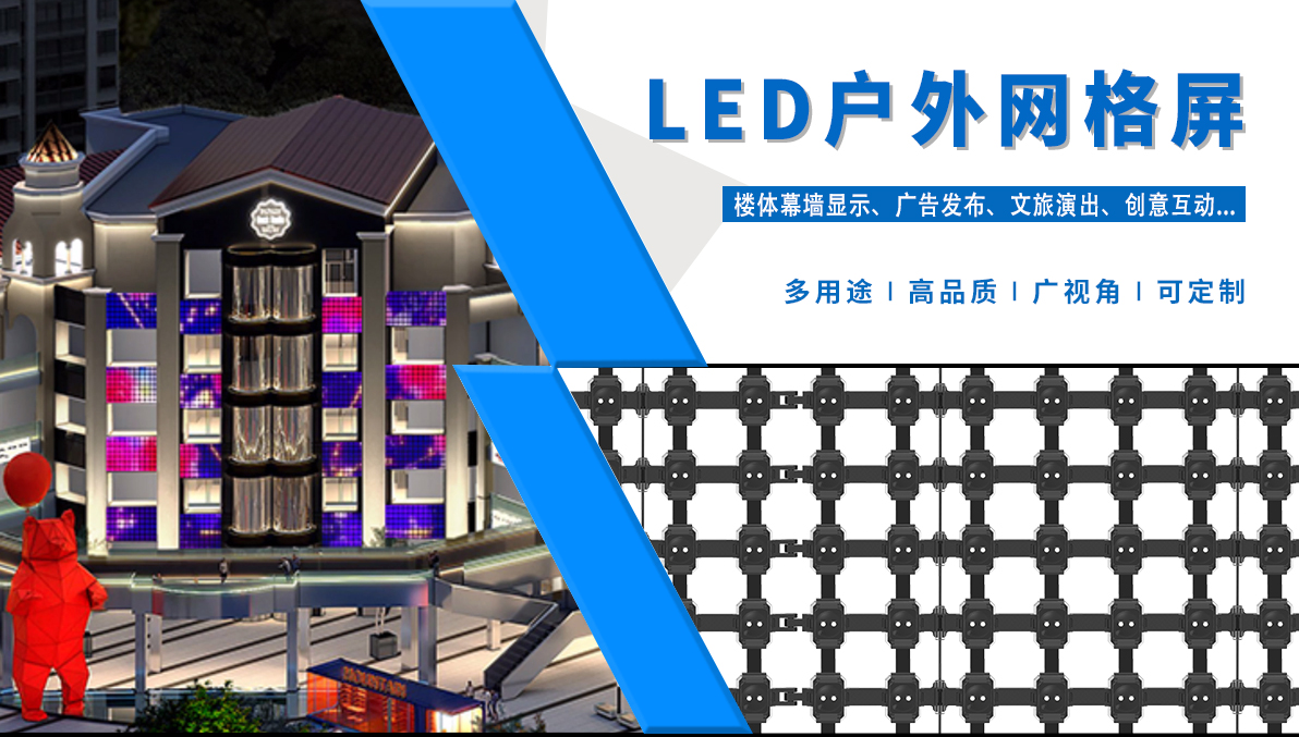 LED透明網(wǎng)格屏,具有透明,靈活,輕便, 易于安裝和維護(hù)的特點(diǎn),適合于多種安裝方式, 比如彎曲,折疊,卷繞,懸掛等,做為一個(gè)整體 透明LED網(wǎng)格屏.極具藝術(shù)性和創(chuàng)造性,可以自由 組合成各種形狀。廣泛應(yīng)用于建筑立面或天幕等 的大型屏幕的制作。