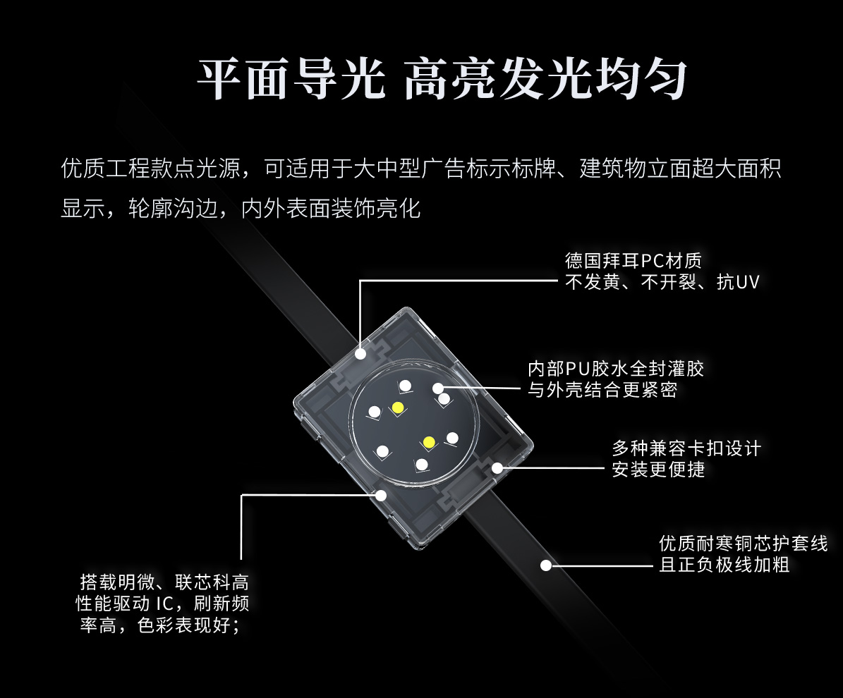 產品用途: 1.穩(wěn)定成熟的封灌結構,散熱性能好,安裝簡單; 2.采用戶外專用防水燈珠,色彩純正,性能穩(wěn)定; 3.搭載明微、聯(lián)芯科高性能驅動 IC,刷新頻率高,色彩表現(xiàn)好; 4.可適用于大中型廣告標示標牌、建筑物立面超大面積顯示, 輪廓溝邊,內外表面裝飾亮化; 安裝方式:1.卡鋁槽 2.裝鋼絲卡扣 3.打孔安裝