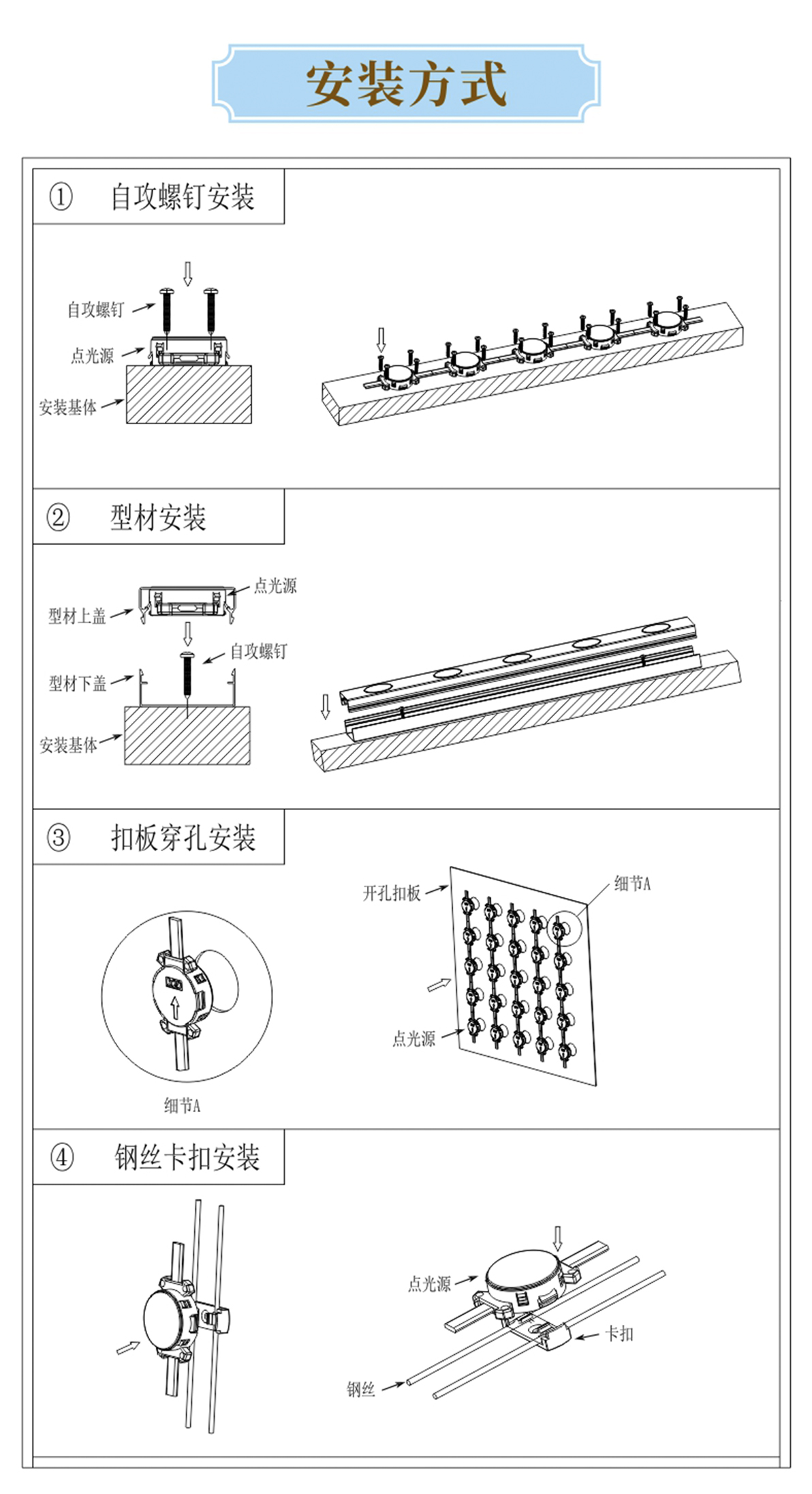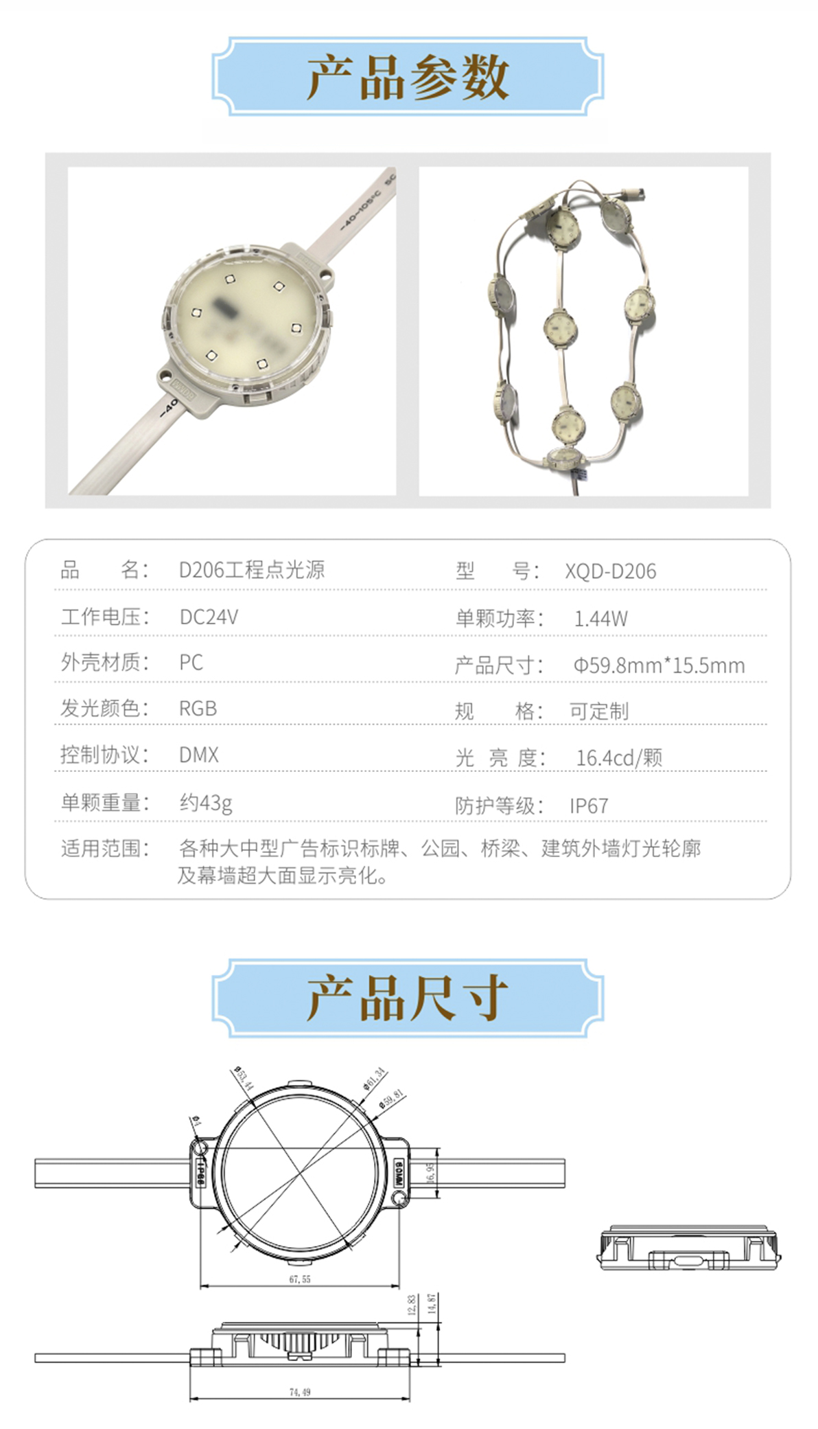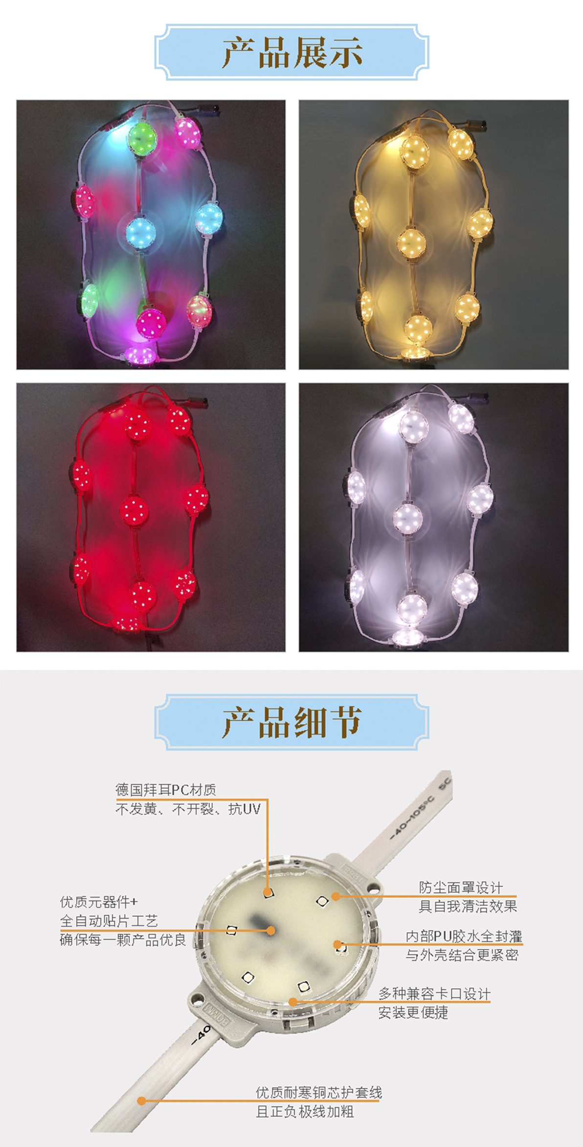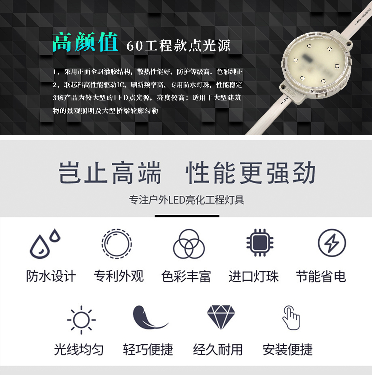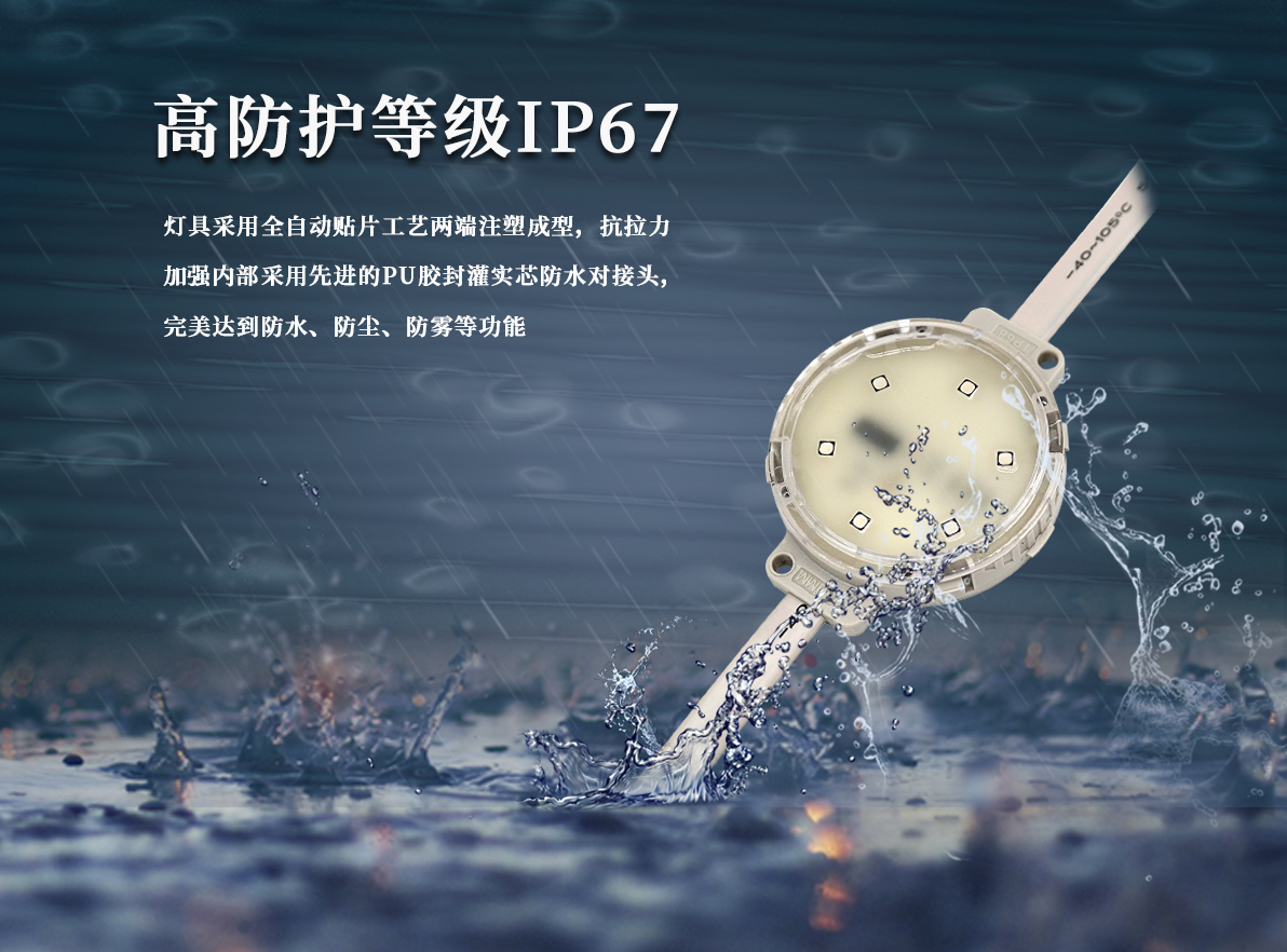 產(chǎn)品用途: 1.采用正面全封灌膠結(jié)構(gòu),散熱性能好,防護(hù)等級(jí)高; 2.采用戶外專用防水燈珠,色彩純正,性能穩(wěn)定; 3.搭載明微、聯(lián)芯科高性能驅(qū)動(dòng) IC,刷新頻率高,色彩表現(xiàn)好; 4.該產(chǎn)品為較大型的 LED 點(diǎn)光源,亮度較高; 適用于大型建筑物的景觀照明及大型橋梁輪廓勾勒。 安裝方式:1.卡鋁槽 2.裝鋼絲卡扣 3.打孔安裝