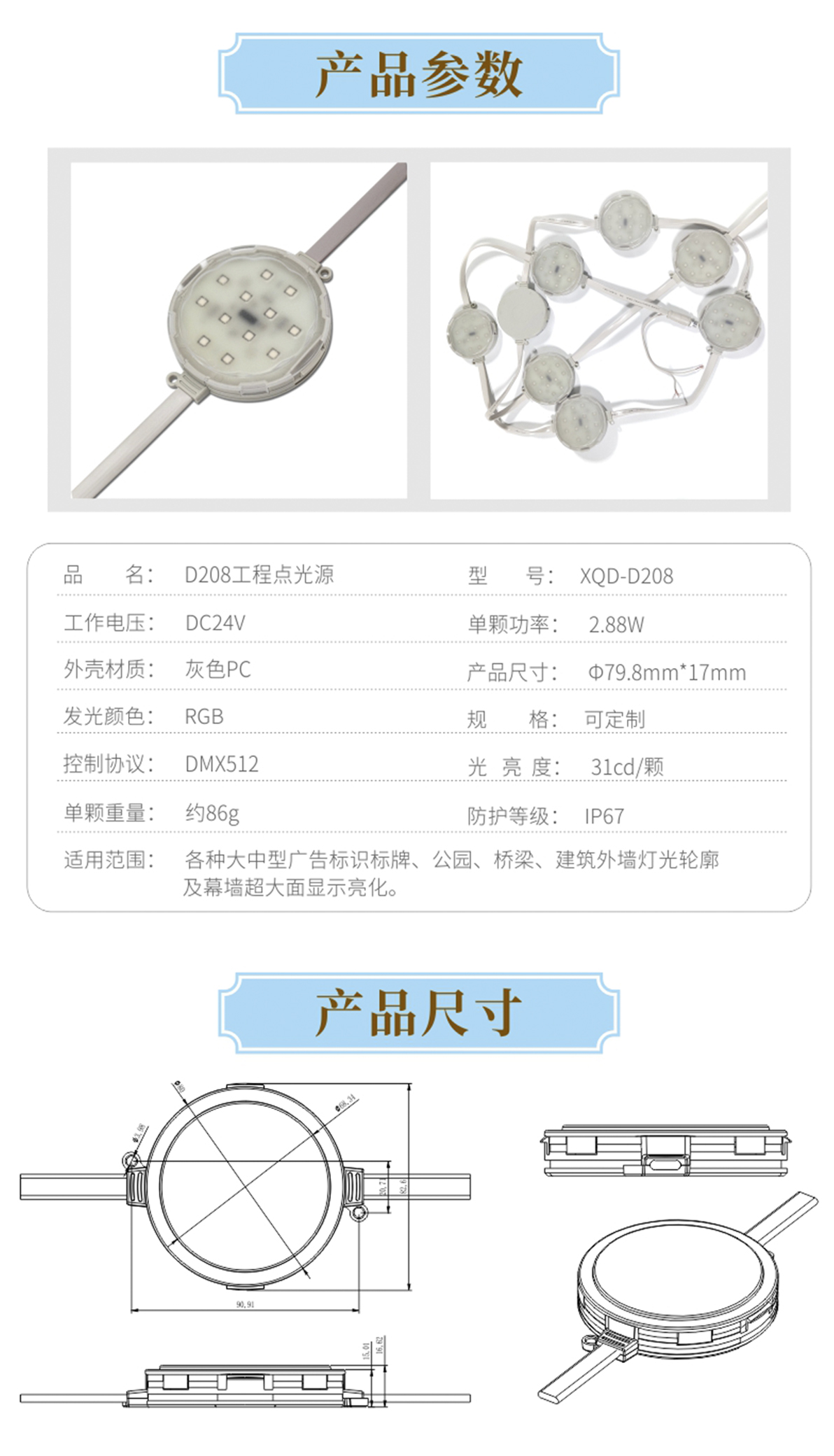 產(chǎn)品用途: 1.采用正面全封灌膠結(jié)構(gòu),散熱性能好,防護等級高; 2.采用戶外專用防水燈珠,色彩純正,性能穩(wěn)定; 3.搭載明微、聯(lián)芯科高性能驅(qū)動 IC,刷新頻率高,色彩表現(xiàn)好; 4.該產(chǎn)品為較大型的 LED 點光源,亮度較高; 適用于大型建筑物的景觀照明及大型橋梁輪廓勾勒。 安裝方式: 1.卡鋁槽 2.裝鋼絲卡扣 3.打孔安裝. 4 螺絲固定
