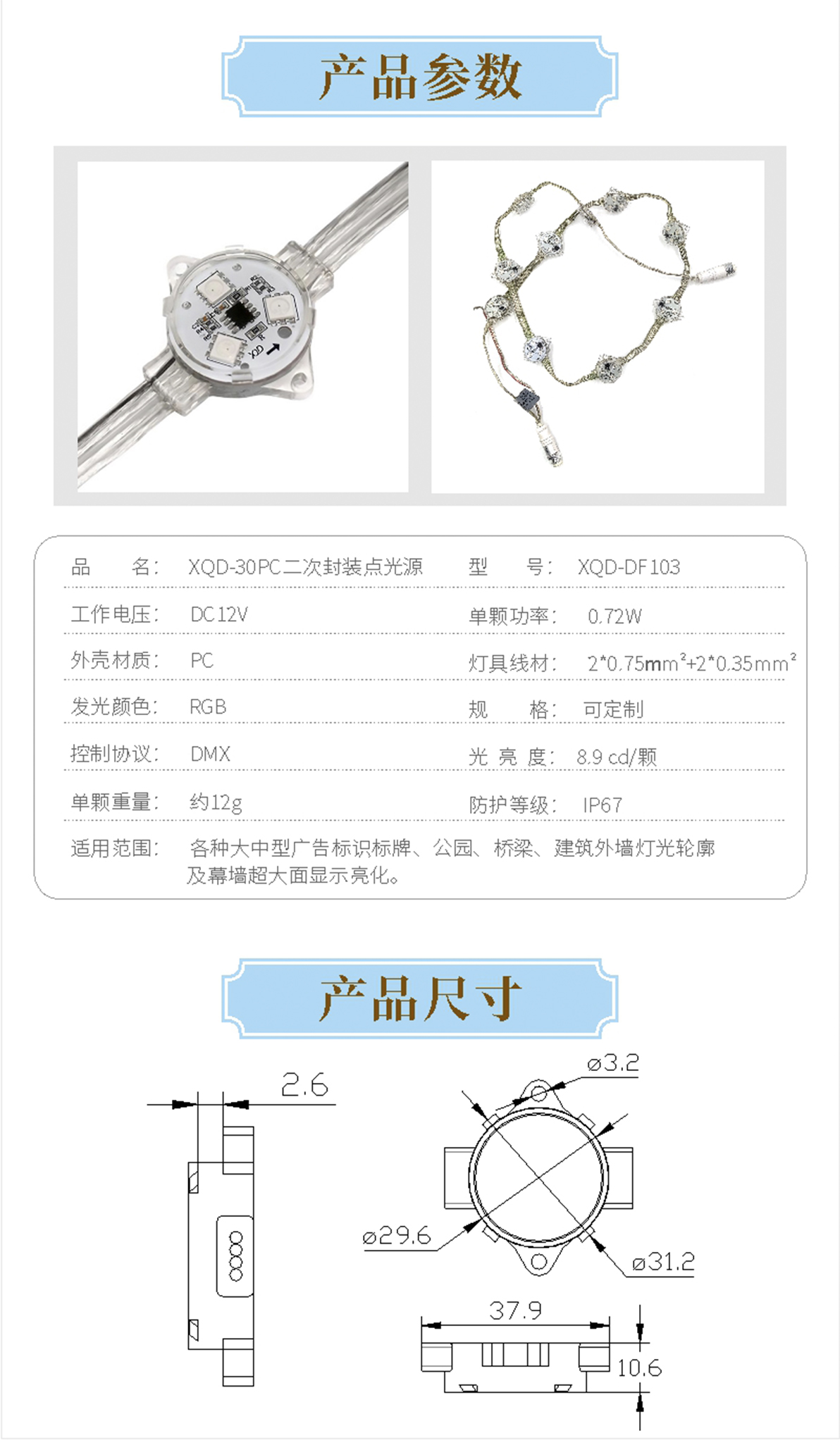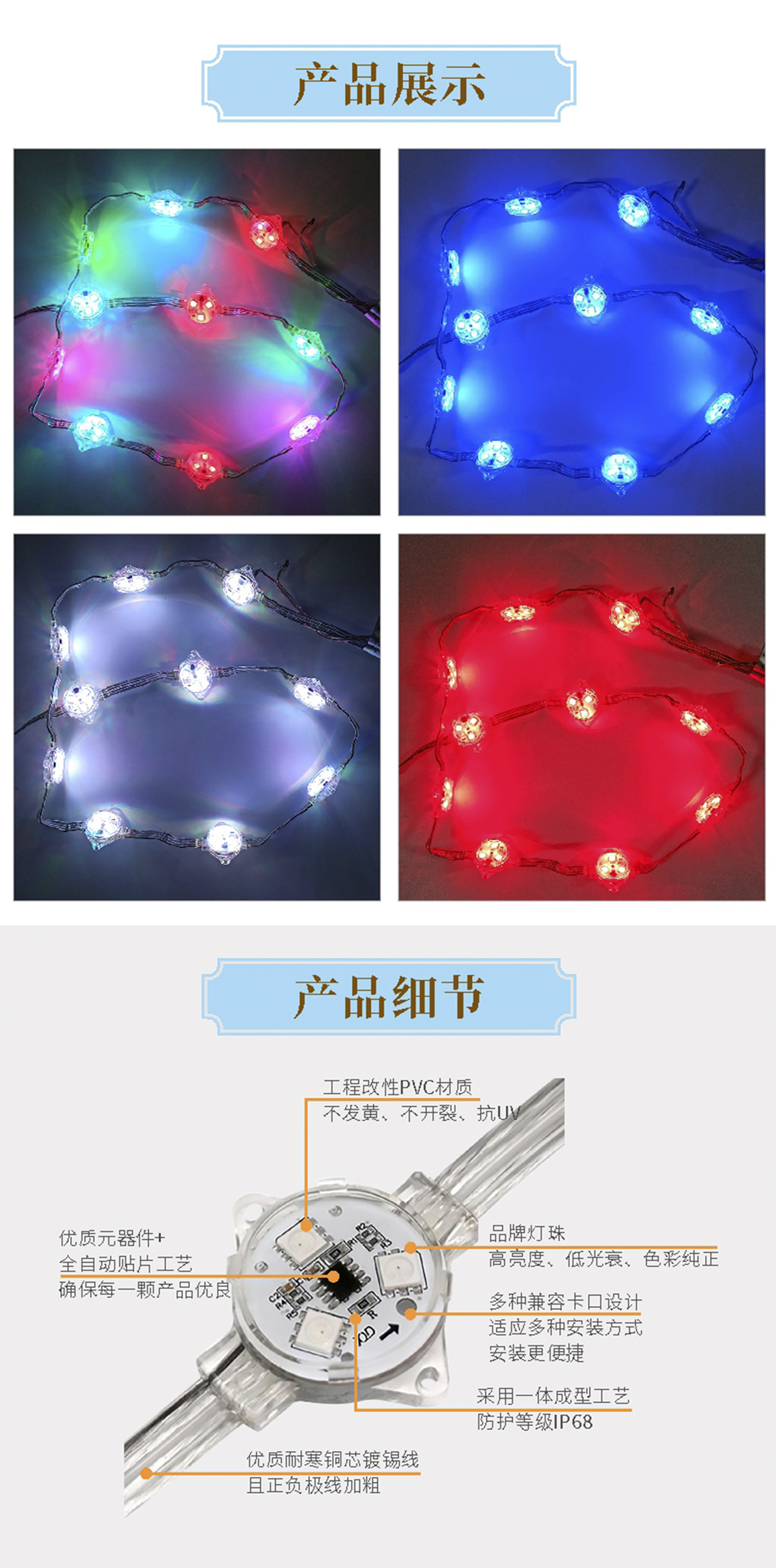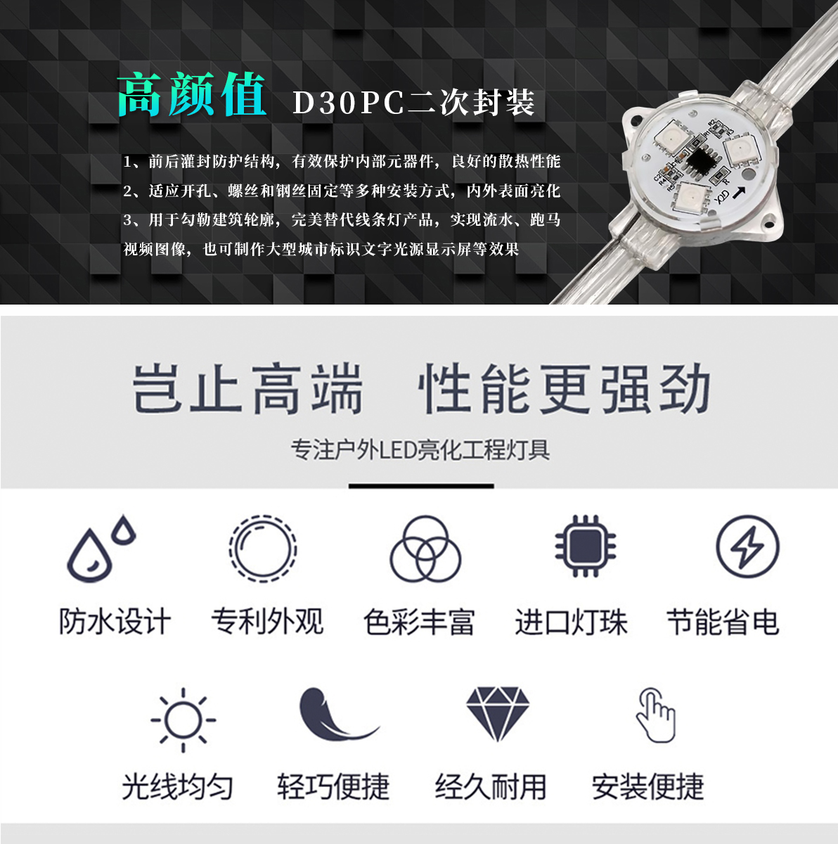 產(chǎn)品特點(diǎn): 1.前后灌封防護(hù)結(jié)構(gòu),有效保護(hù)內(nèi)部元器件,良好的散熱性能; 2.適應(yīng)開(kāi)孔安裝、螺絲固定、或鋼絲固定安裝等多種安裝方式; 3.常用于勾勒建筑輪廓,完美替代線(xiàn)條燈產(chǎn)品,實(shí)現(xiàn)流水、跑馬、 視頻圖像等效果,也可制作大型廣告顯示屏、大型城市標(biāo)識(shí)和文字光源。 輪廓溝邊,內(nèi)外表面裝飾亮化;