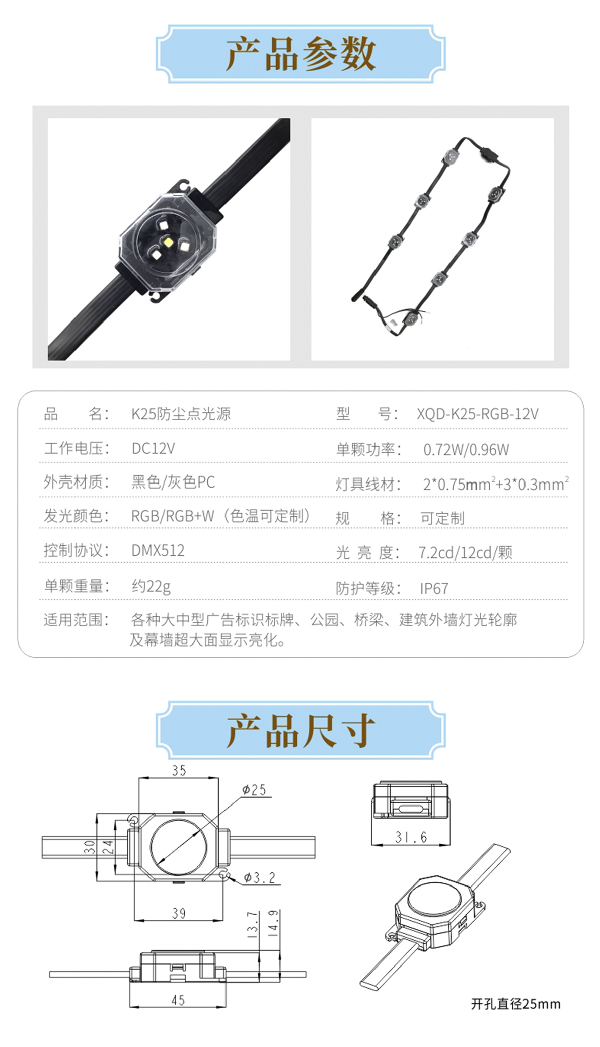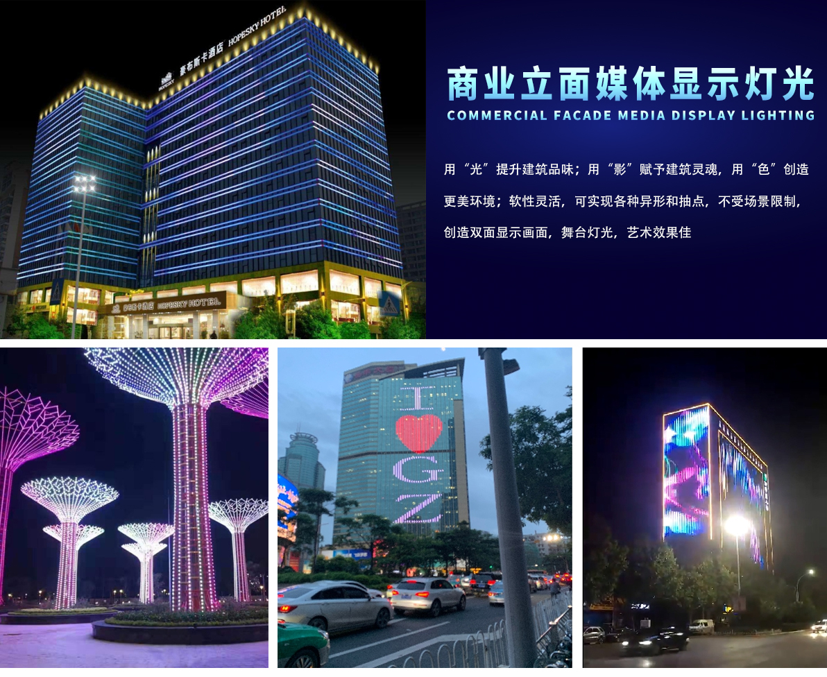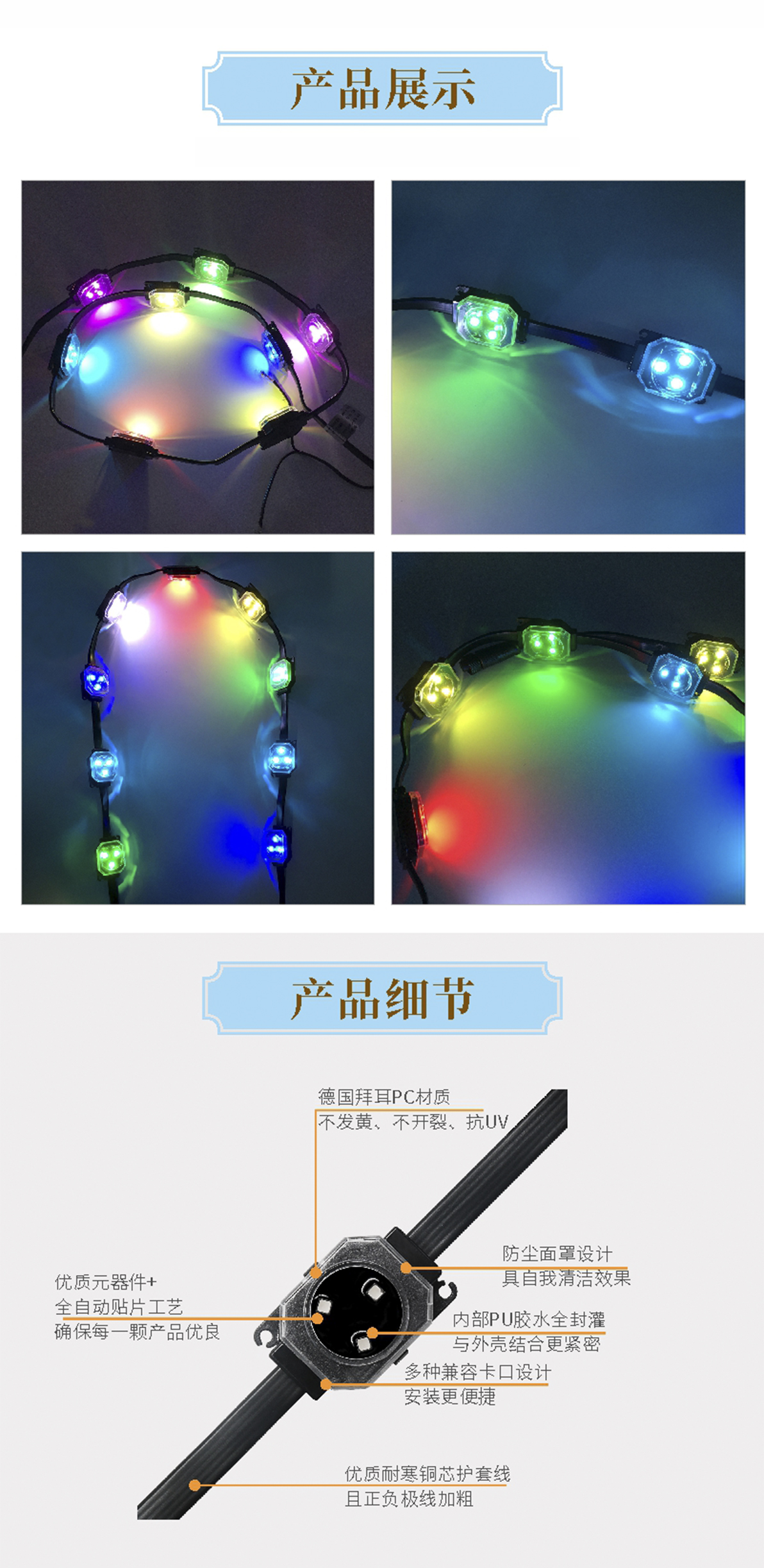 產(chǎn)品特點: 1.采用正面灌膠和獨特PC罩,防護等級高; 2.加厚型優(yōu)質(zhì)阻然膠料,抗UV、抗鹽霧、耐沖擊; 3.適應多種安裝方式,安裝簡單可靠; 4.優(yōu)質(zhì)進口燈珠,亮度高、色彩純正,穩(wěn)定性好; 5.該產(chǎn)品做工優(yōu)良,性價比高,是大型建筑物的景觀亮化及大型橋梁燈光的理 想產(chǎn)品。 安裝方式:1.卡鋁槽 2.裝鋼絲卡扣 3.打孔安裝 4.打螺絲固定