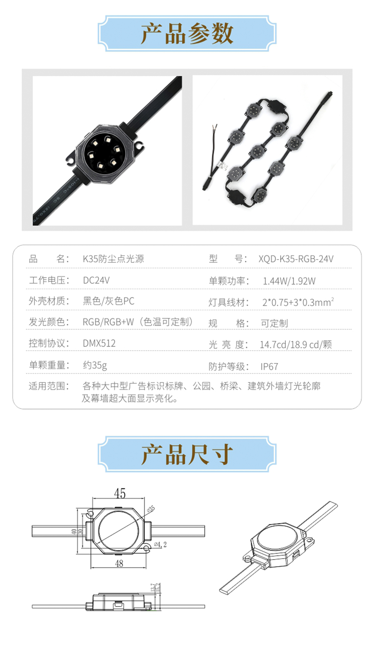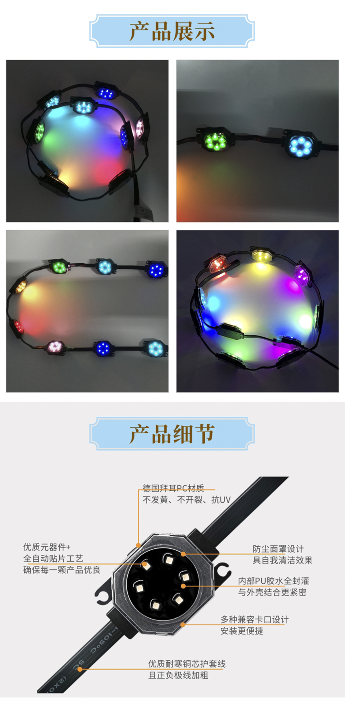 產(chǎn)品特點(diǎn): 1.采用正面灌膠和獨(dú)特PC罩,防護(hù)等級(jí)高; 2.加厚型優(yōu)質(zhì)阻然膠料,抗UV、抗鹽霧、耐沖擊; 3.適應(yīng)多種安裝方式,安裝簡(jiǎn)單可靠; 4.優(yōu)質(zhì)進(jìn)口燈珠,亮度高、色彩純正,穩(wěn)定性好; 5.該產(chǎn)品做工優(yōu)良,性?xún)r(jià)比高,是大型建筑物的景觀亮化及大型橋梁燈光的理 想產(chǎn)品。 安裝方式:1.卡鋁槽 2.裝鋼絲卡扣 3.打孔安裝 4.打螺絲固定