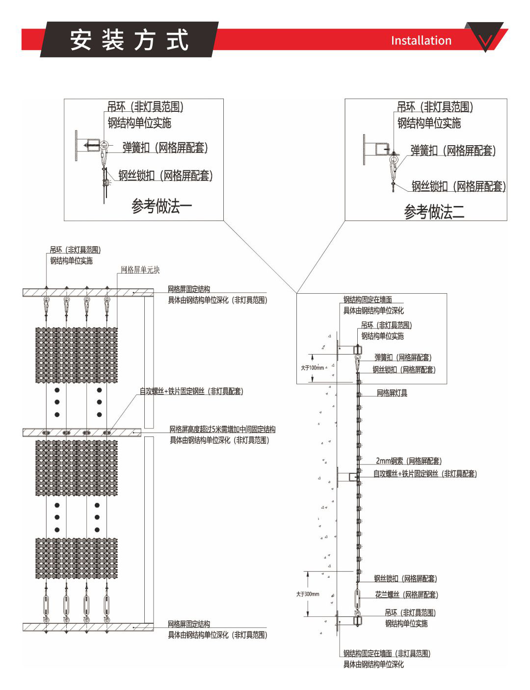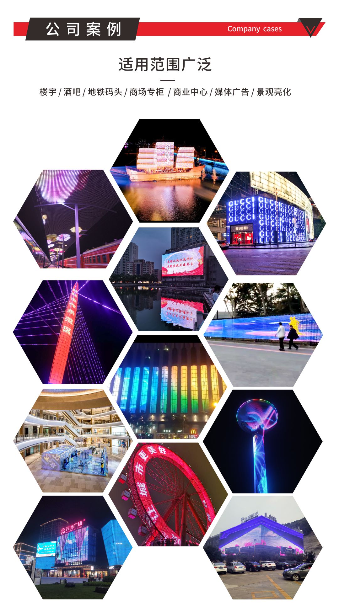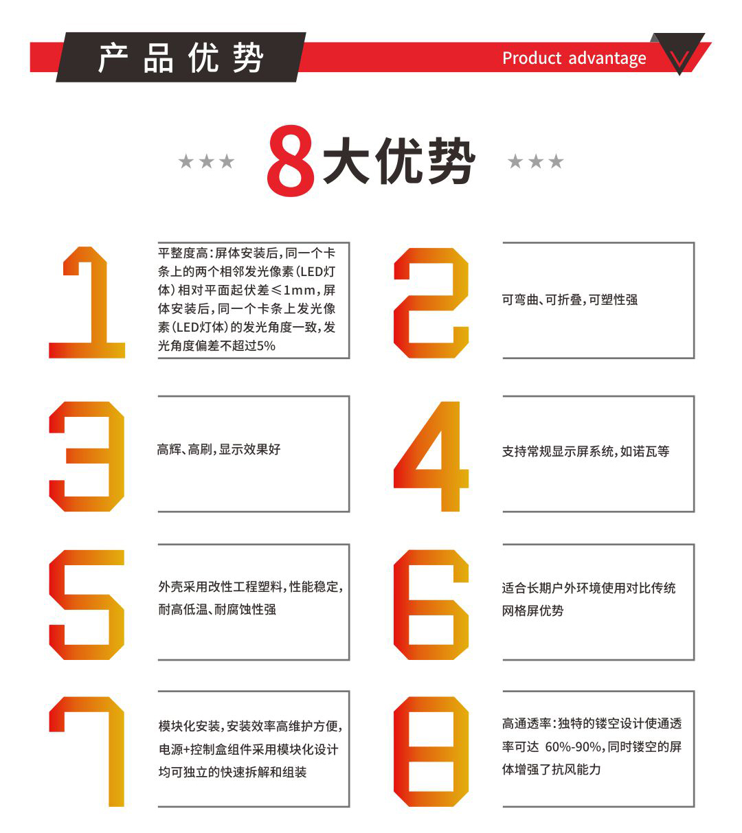 LED透明網(wǎng)格屏,具有透明,靈活,輕便, 易于安裝和維護(hù)的特點(diǎn),適合于多種安裝方式, 比如彎曲,折疊,卷繞,懸掛等,做為一個(gè)整體 透明LED網(wǎng)格屏.極具藝術(shù)性和創(chuàng)造性,可以自由 組合成各種形狀。廣泛應(yīng)用于建筑立面或天幕等。 的大型屏幕的制作。 優(yōu)勢(shì)總結(jié) ?創(chuàng)意設(shè)計(jì)空間大:靈活的剪裁和彎曲特性為設(shè)計(jì)師提供了更多可能性。 ? 安裝便利:重量輕、無(wú)需復(fù)雜鋼結(jié)構(gòu),可前裝或后裝,節(jié)省安裝成本。 ? 耐用性強(qiáng):高防護(hù)等級(jí)和優(yōu)異散熱性能延長(zhǎng)了使用壽命,可達(dá)十年以上 2 。 ? 節(jié)能環(huán)保:低功耗設(shè)計(jì)減少了能源消耗,符合現(xiàn)代綠色環(huán)保理念。 綜上,LED網(wǎng)格屏憑借其高清晰度、高通透率、輕薄設(shè)計(jì)等特性,在多個(gè)領(lǐng)域展現(xiàn)出顯著優(yōu)勢(shì),是現(xiàn)代顯示技術(shù)的重要?jiǎng)?chuàng)新之一。